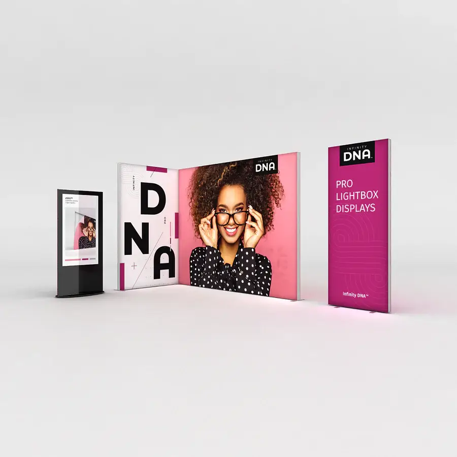 The Infinity DNA™ Pro Lightbox Collection provides the ultimate in high definition illuminated display graphics. Our patented eSEG™ Frame and Fabric technology combined with high-powered OSRAM LED lighting components provide a superb color consistency that extends beyond the frame from edge-to-edge for an immersive viewing experience. Combine different sizes together to create your own display environment.