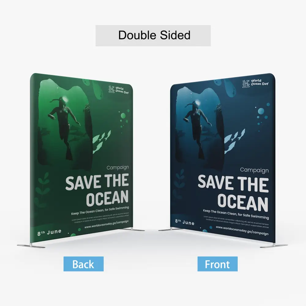 Our tension displays consist of a lightweight but durable aluminum hardware and a fabric dye sublimated print. The hardware is inserted inside the print, much like a pillow into a pillowcase. The fabric print is stretched tight across the frame and zipped close.