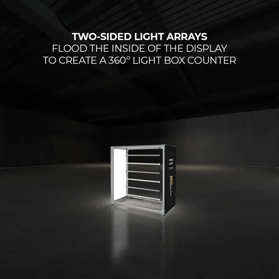 Breathe new light into your brand, exhibit, event or retail shop with the WaveLight® Casonara SEG Light Counters. This pioneering new SEG tension fabric light box is designed to make backlit graphics more portable, modular and customizable. Our 360º illumination technology provides more visibility for your brand and more places to present your ideas. We have also color coded the frames which provides our users the ability to quickly assemble and disassemble the display without tools ––or breaking a sweat.