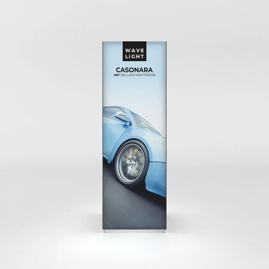 Breathe new light into your brand, exhibit, event or retail shop with the WaveLight® Casonara Tower Light Box Displays. This pioneering new SEG tension fabric light box is designed to make backlit graphics more portable, modular and customizable. Our 360º illumination technology provides more visibility for your brand and more places to present your ideas. We have also color coded the frames which provides our users the ability to quickly assemble and disassemble the display without tools ––or breaking a sweat.